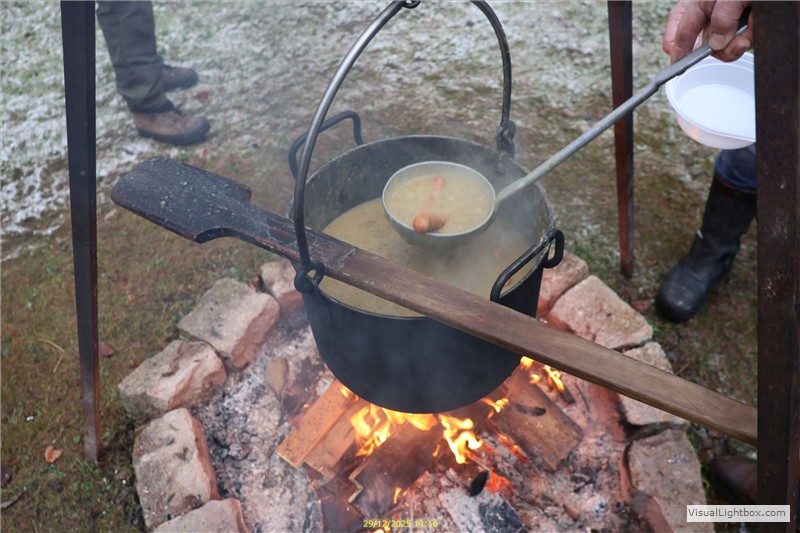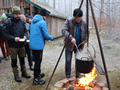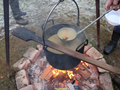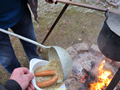 Alle haben schon Hunger, deswegen hängt der Kessel mit Erbsensuppe mit Würstchen über dem Feuer.