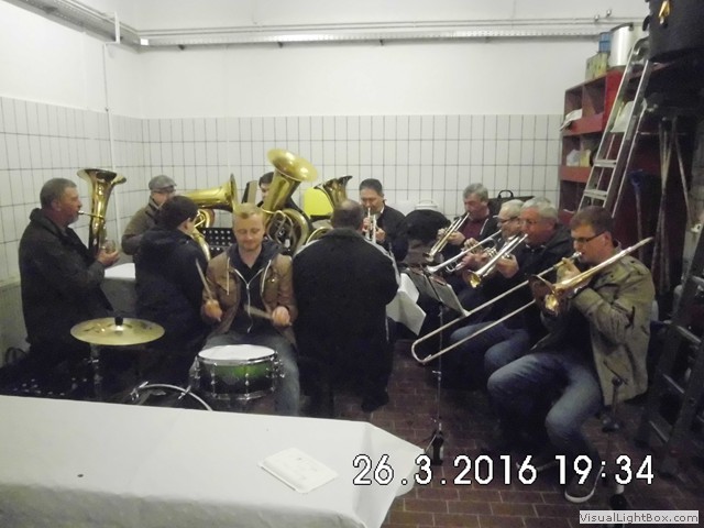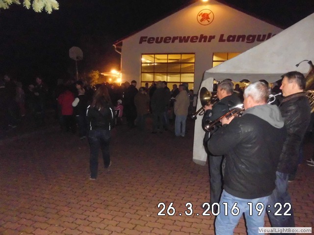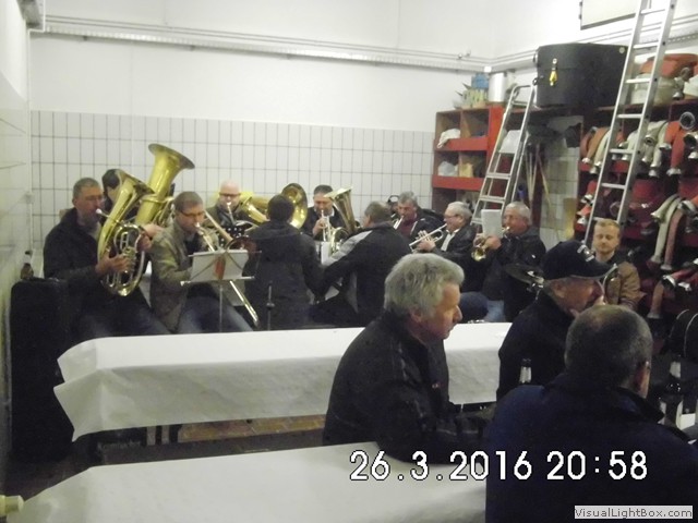 Mit Blasmusik werden die Flammen anmiert richtig schön zu brennen. Auch in der Fahrzeughalle werden die noch freien Plätze belegt.