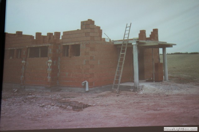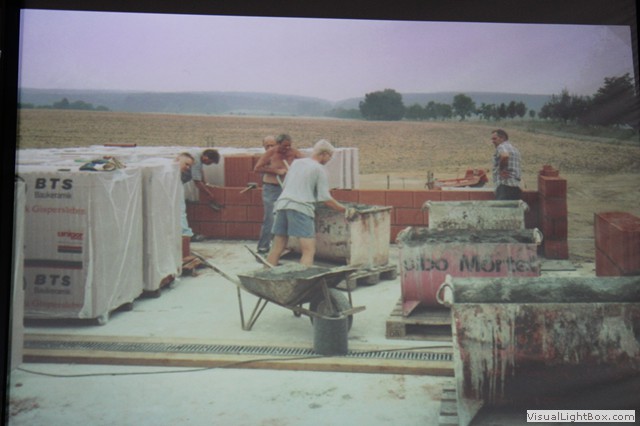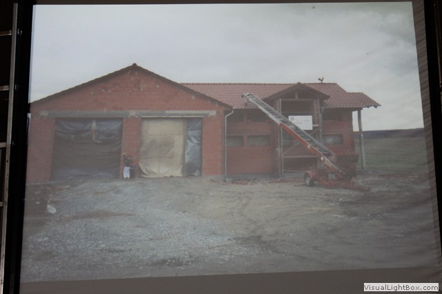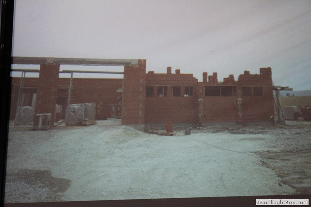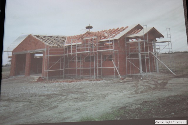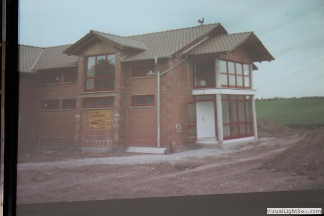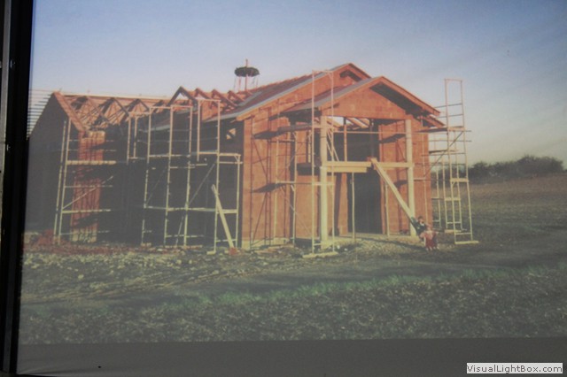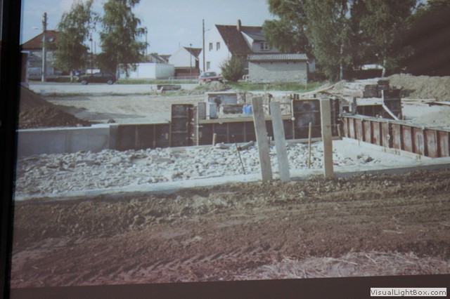 Im Hintergrund laufen auf einer Leinwand Bilder ab, die die Baumaßnahmen zeigen.