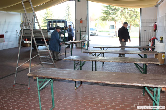 Die Senioren gestalten die Fahrzeughalle u. bauen Tische u. Bänke auf.