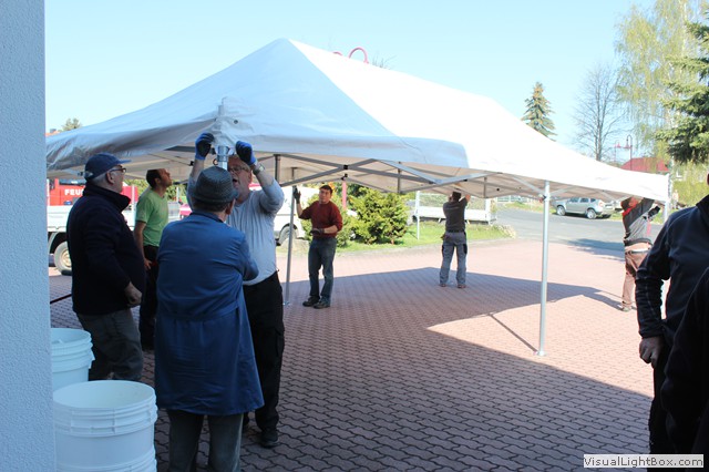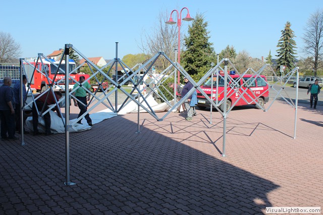 Das Zelt wird geholt und mit wenigen Handgriffen aufgestellt.