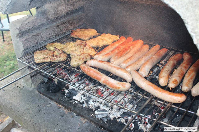Alle bedienen sich am Grillbüfett und den Salatschüsseln. Alles prima, alles lecker.