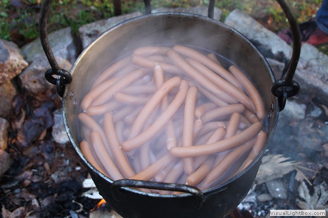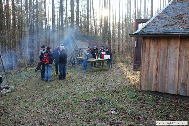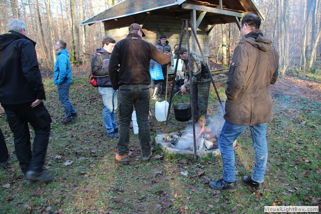 Dort angekommen wird schon das Feuer für den Kessel und der Ofen in der Hütte angeheizt.