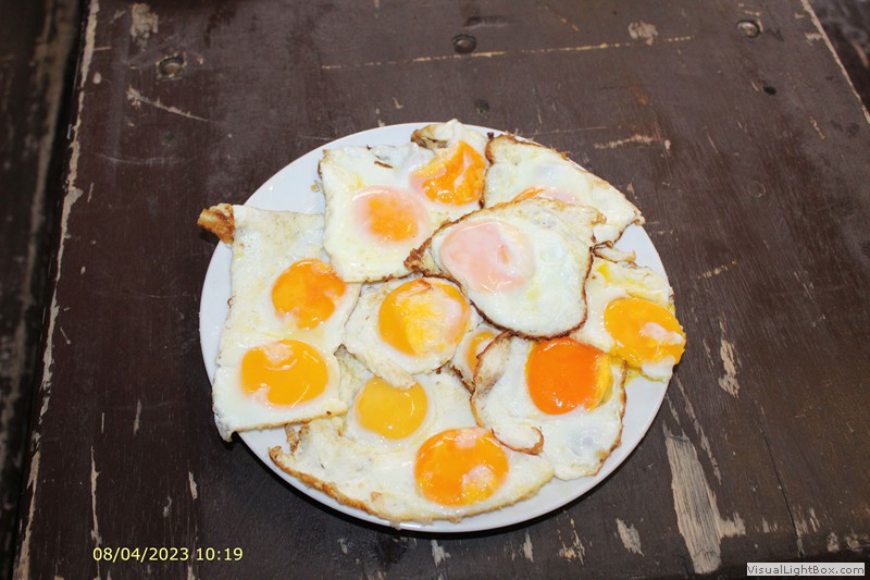 Lecker Spiegeleier, Schlachtepfanne und Wurst stehen auf dem Tisch.