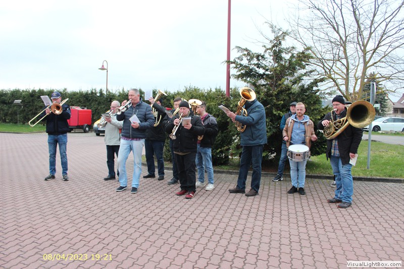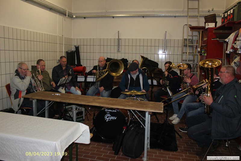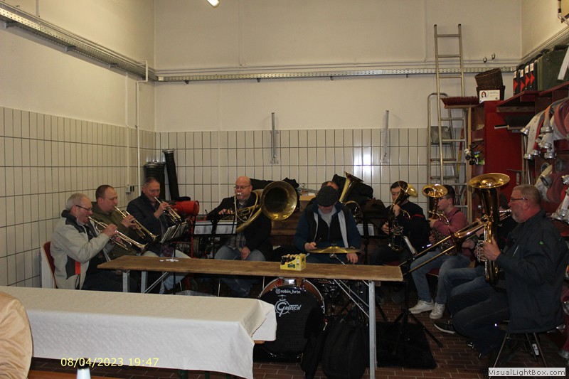 In der Fahrzeughalle spielt schöne Blasmusik. Es ist dieses Jahr schon ein Orchester .