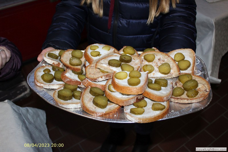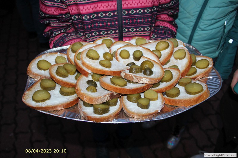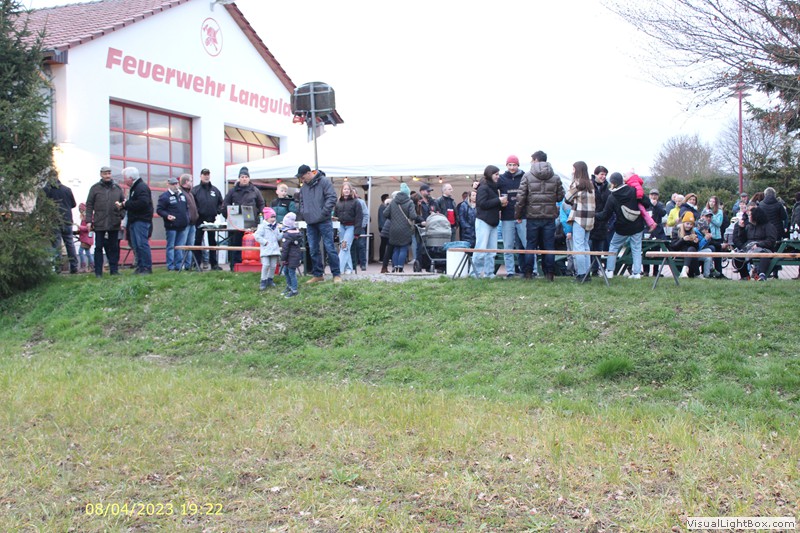 Das Feuer ist jetzt richtig im Gange. Die Jugendfeuerwehr hat Fettbrote vorbereitet, die jetzt verkauft werden.