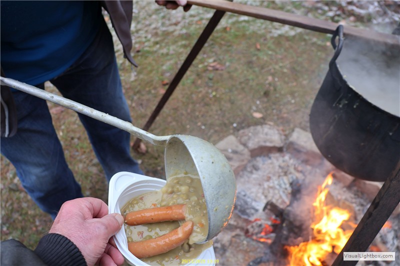 Alle haben schon Hunger, deswegen hängt der Kessel mit Erbsensuppe mit Würstchen über dem Feuer.