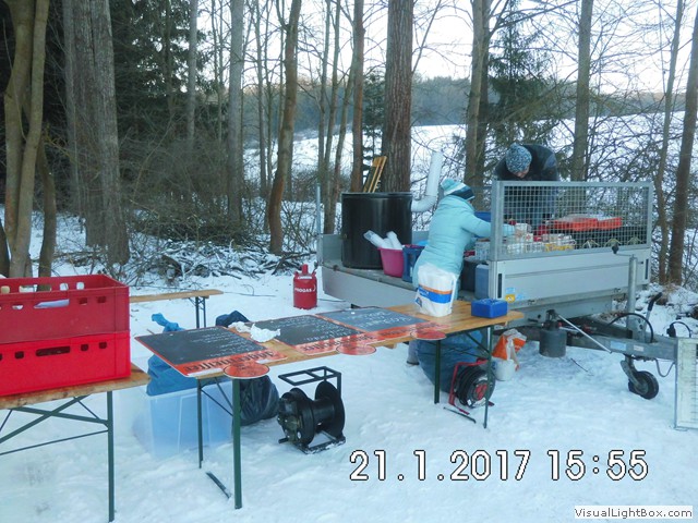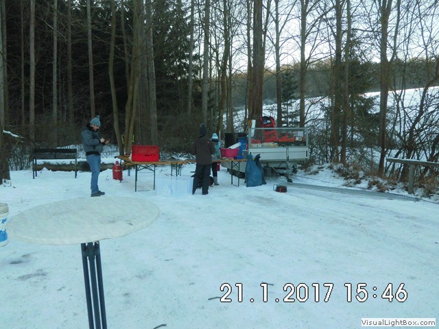 Die Temperatur ist beim Aufbau recht angenehm und liegt bei ca. +1 Grad. Feuerholz wird aufgeschichtet u. Spiele vorbereitet.