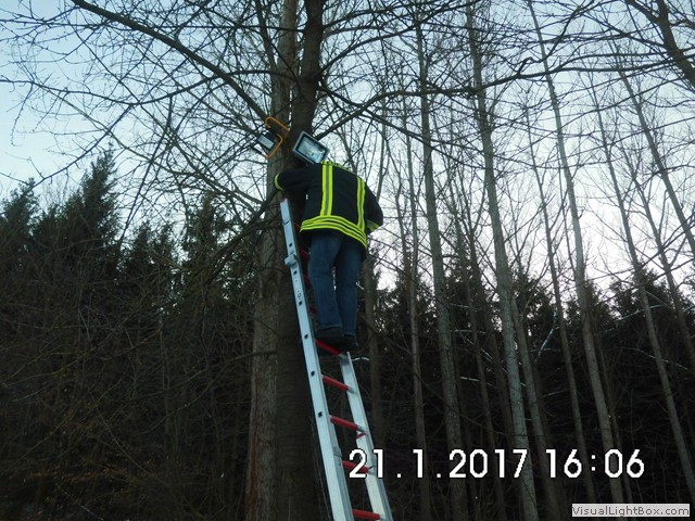 Stromerzeuger werden in den Wald geschleppt und Scheinwerfer an den Bäumen montiert.