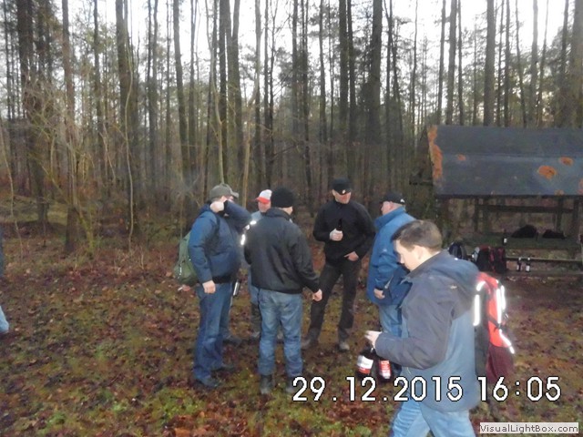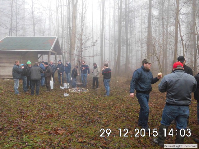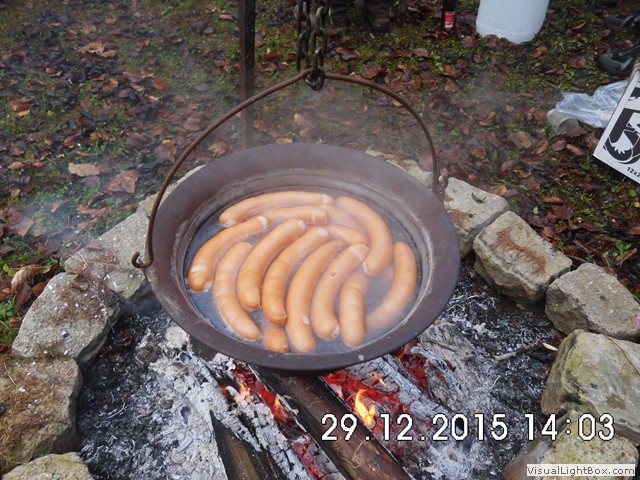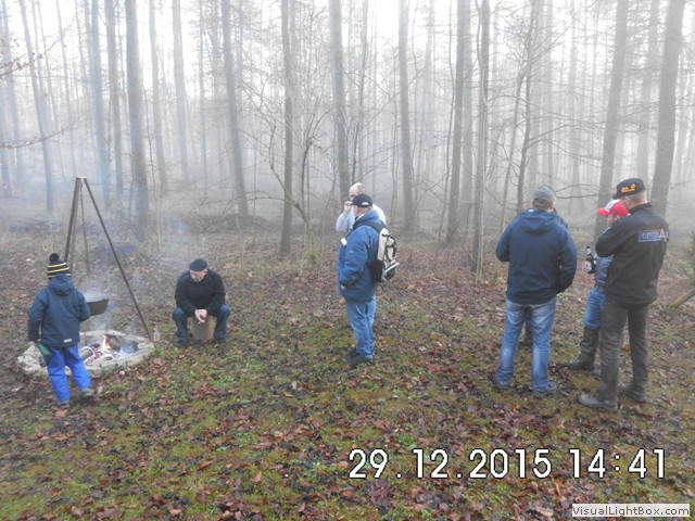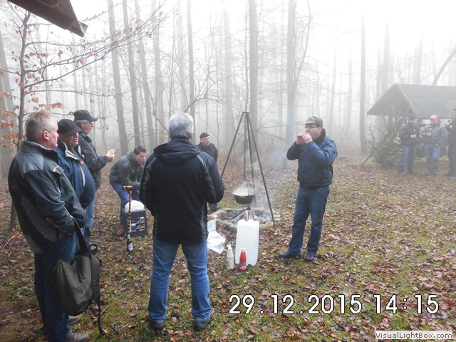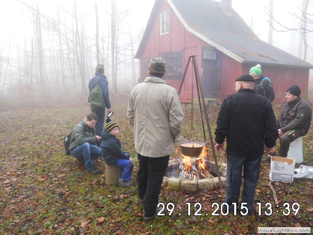 Der Nebel wird wieder dichter also weiter zum Jägerhaus. Hier hängt schon ein Kessel mit Bockwürsten über dem Feuer u. die Hütte